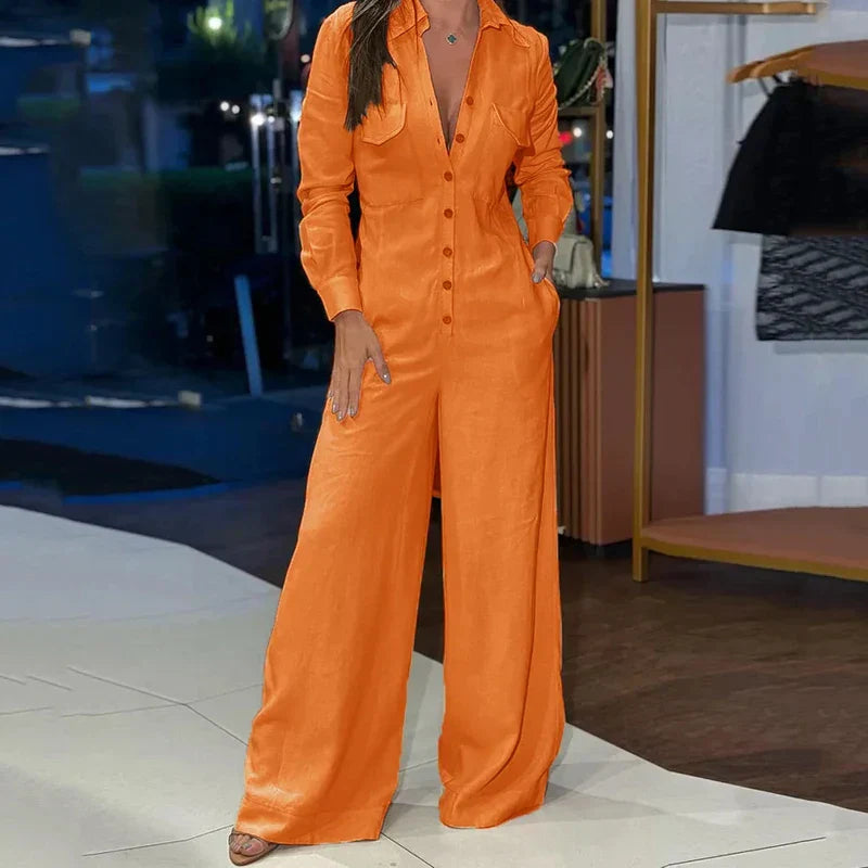 O Macacão Élitaire foi criado para mulheres que não apenas se vestem bem — elas comandam o ambiente. Com mangas longas sofisticadas e uma calça de corte impecável, o destaque fica por conta do fechamento frontal com botões, que adiciona um charme clássico e atemporal à peça, elevando o look a um novo nível de refinamento.